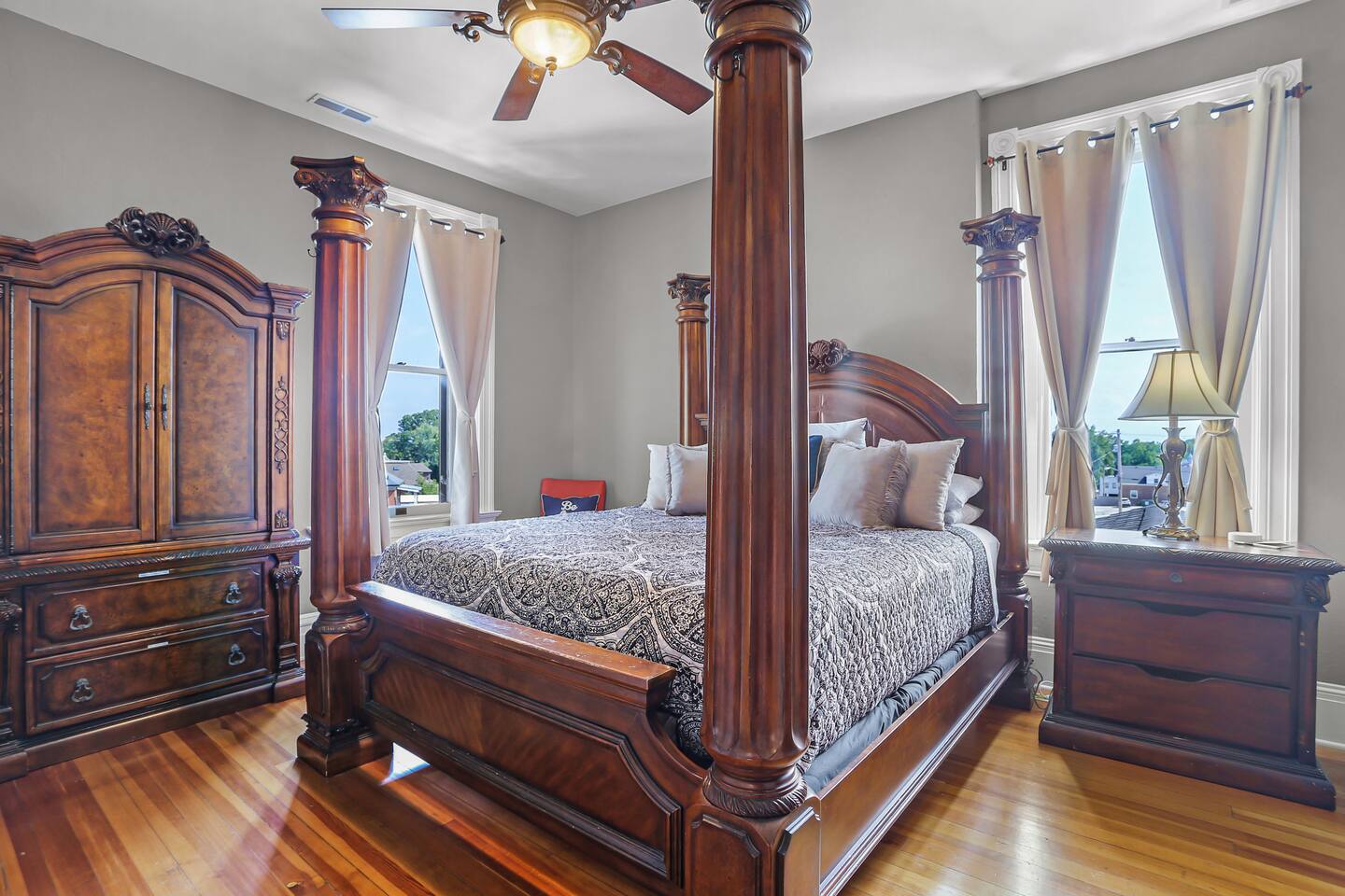 There is a driveway in front of the house is available for guests, which can fit up to 3 vehicles and there is a paved area next to the backyard for 6+ vehicles. With the home being in downtown Washington there is a potential for noise, specially considering that there is a restaurant next door.